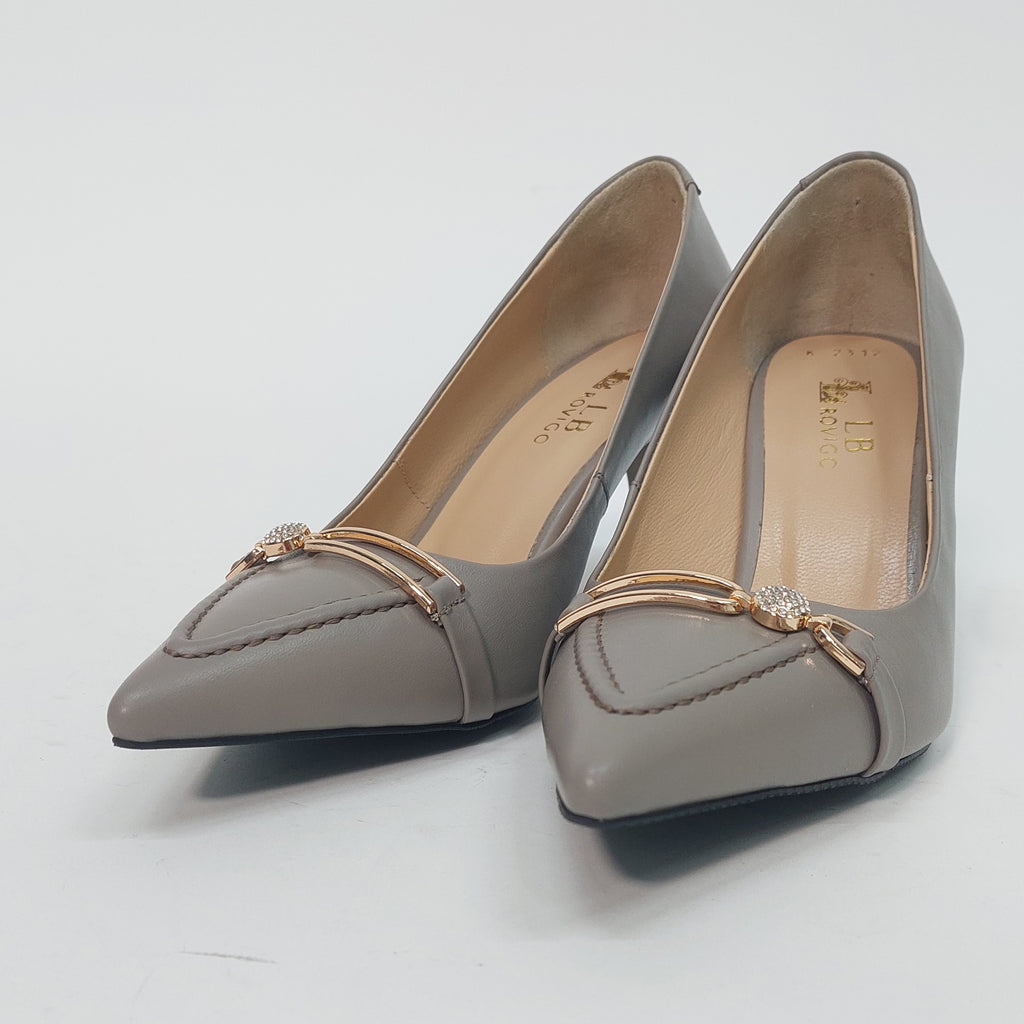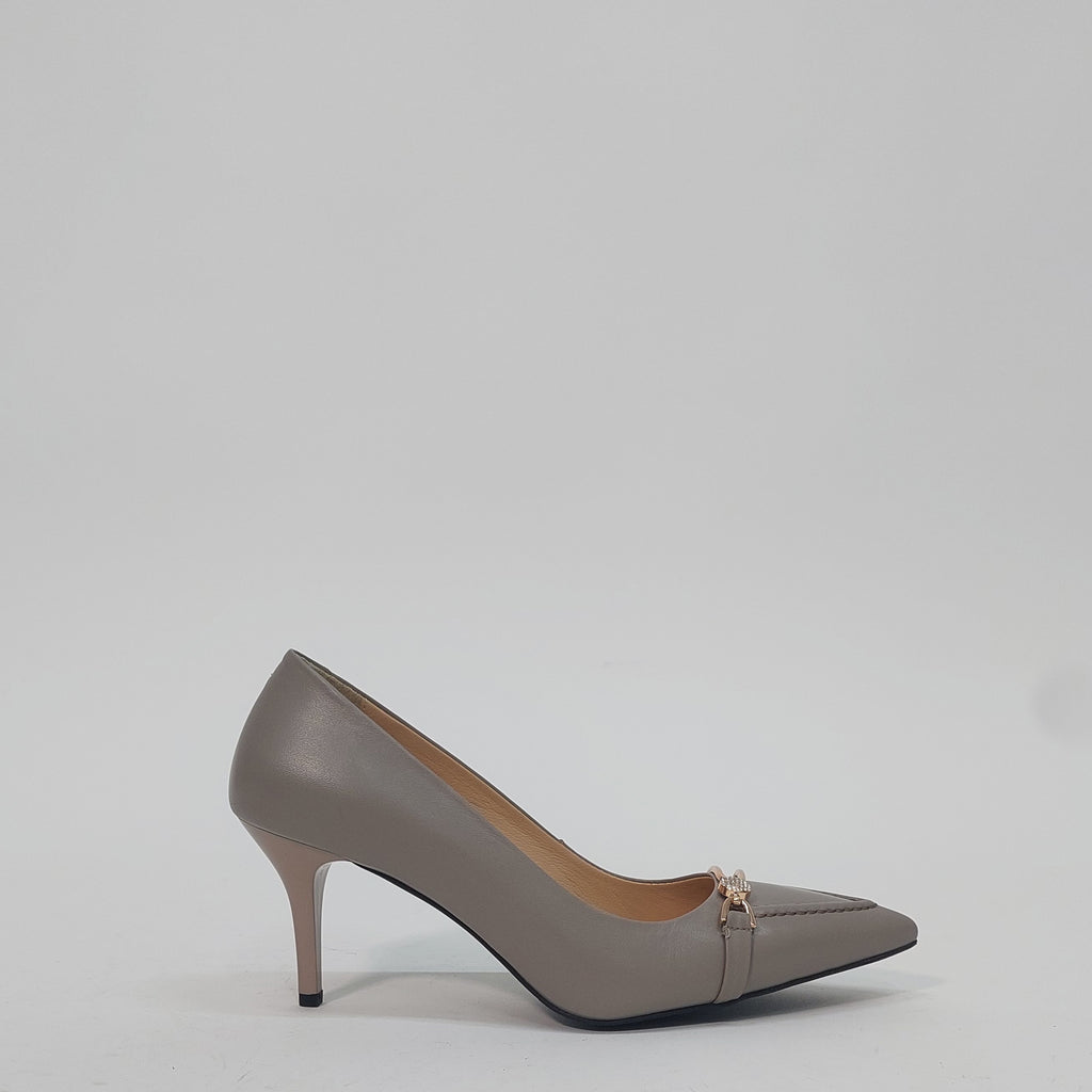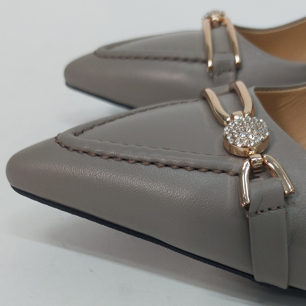 Elegantne salonke u nježnoj sivo-bež nijansi, savršen su izbor za sve prilike koje zahtijevaju profinjen izgled. Izrađene su od kvalitetne eko kože s decentnim zlatnim detaljem i sitnim kristalima na prednjem dijelu, koji daju dozu luksuza bez pretjerivanja. Stabilna potpetica srednje visine omogućava udobnost tokom cijelog dana.