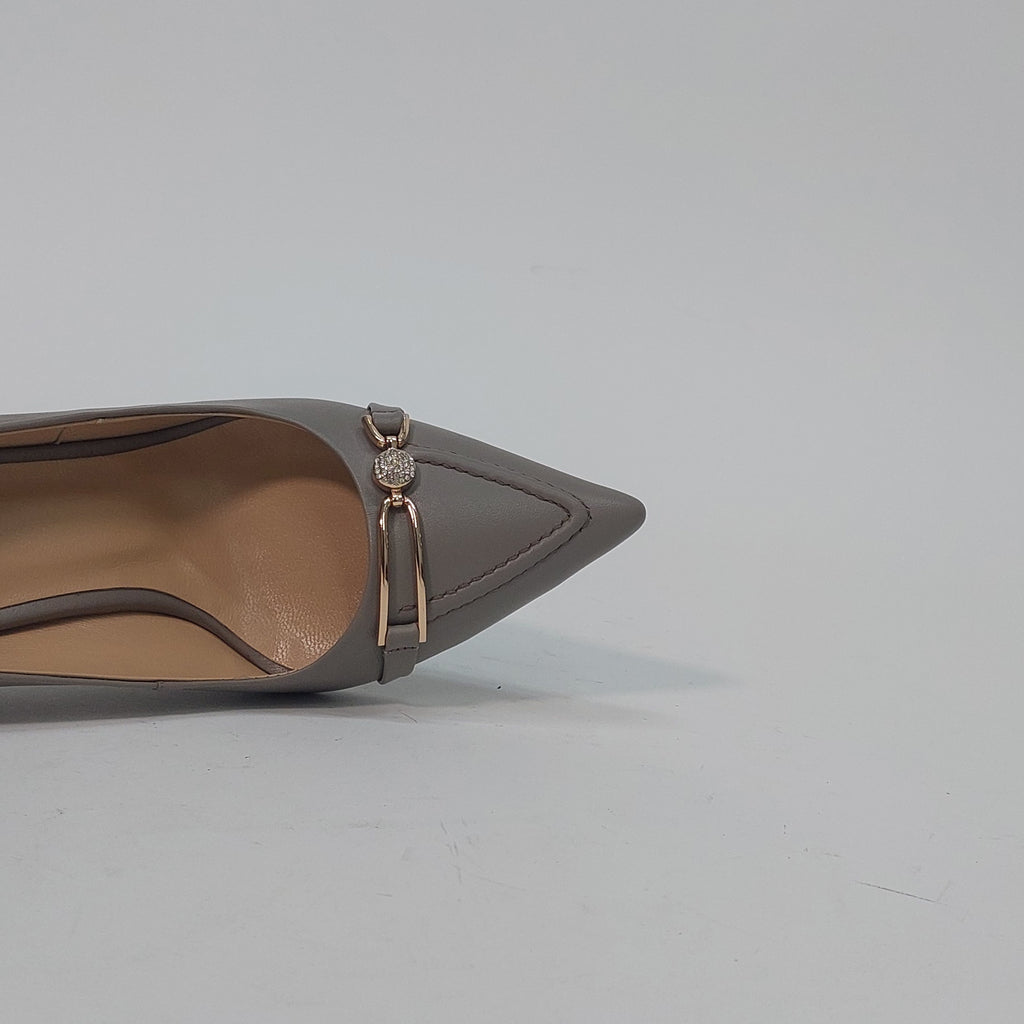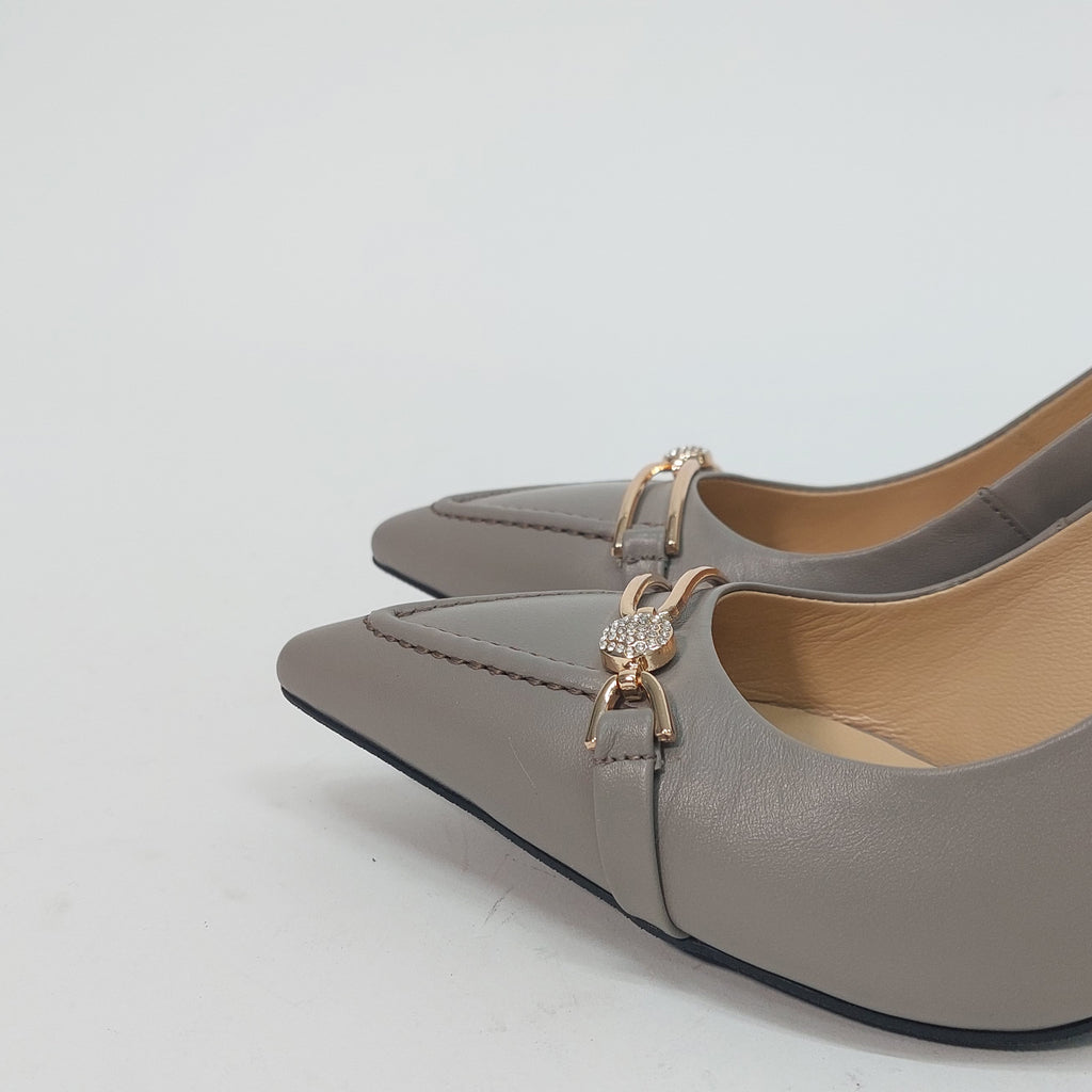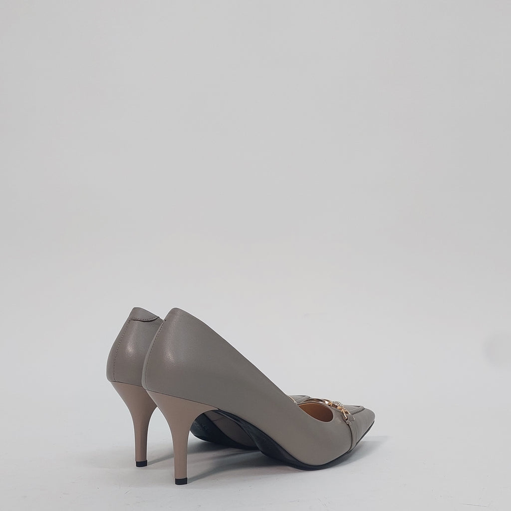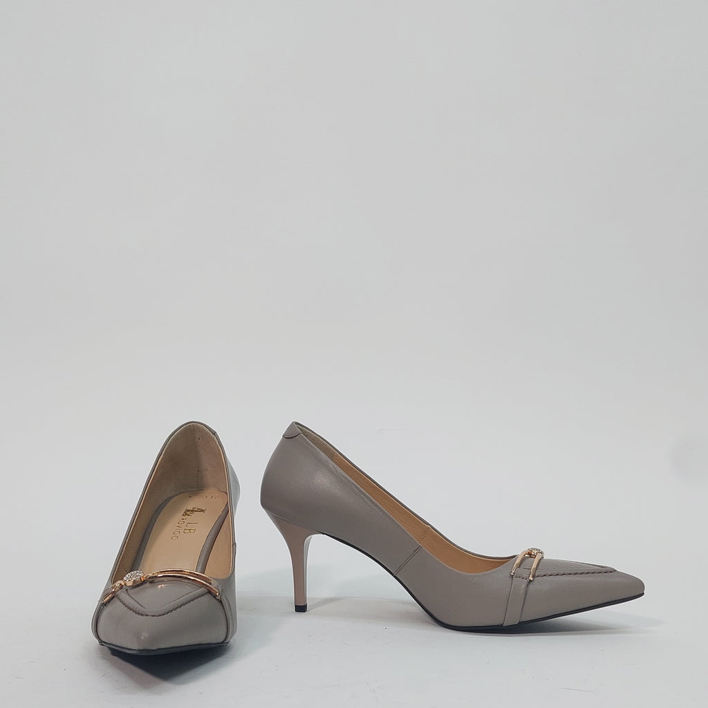 Elegantne salonke u nježnoj sivo-bež nijansi, savršen su izbor za sve prilike koje zahtijevaju profinjen izgled. Izrađene su od kvalitetne eko kože s decentnim zlatnim detaljem i sitnim kristalima na prednjem dijelu, koji daju dozu luksuza bez pretjerivanja. Stabilna potpetica srednje visine omogućava udobnost tokom cijelog dana.