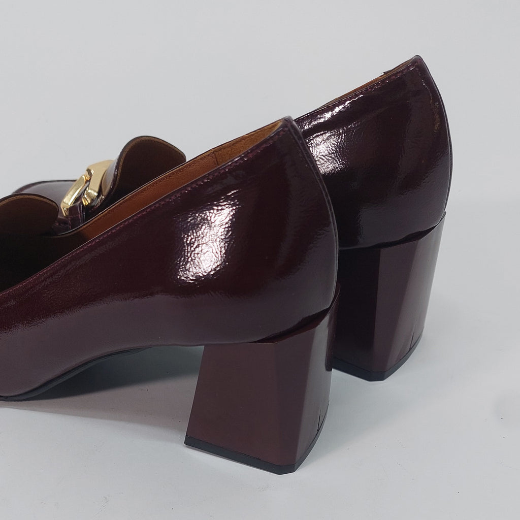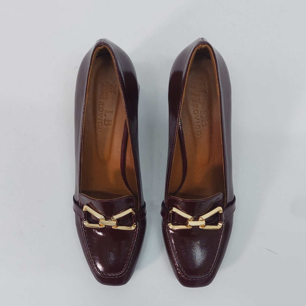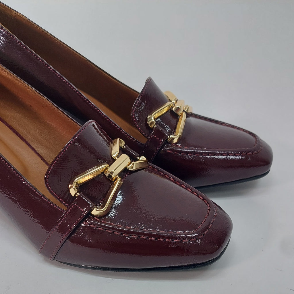 Elegantne salonke izrađene od prirodne kože visokog sjaja, savršen izbor za dame koje žele spoj poslovne elegancije i udobnosti. Klasičan dizajn upotpunjen je dekorativnom kopčom na prednjem dijelu, dok stabilna blok peta pruža sigurnost i lakoću kretanja tokom cijelog dana.