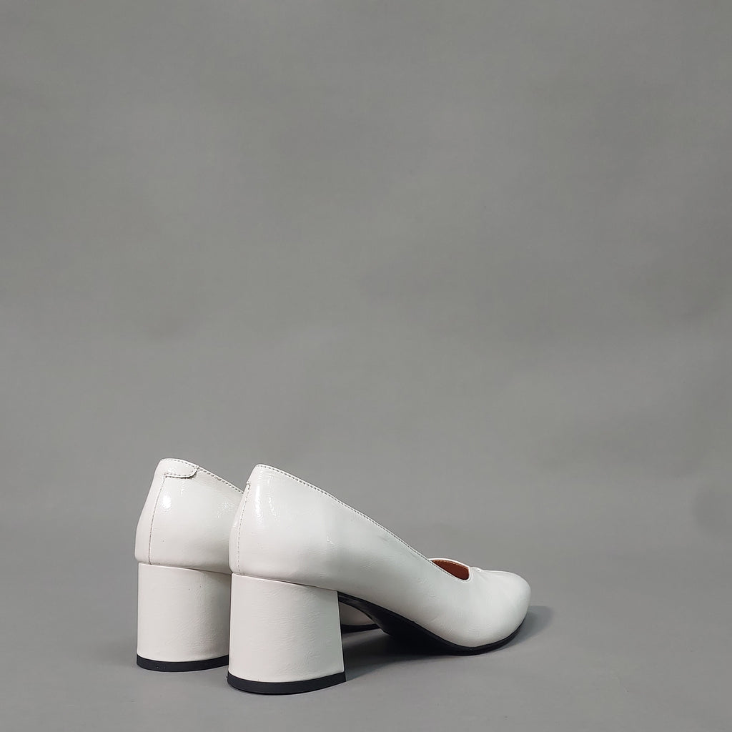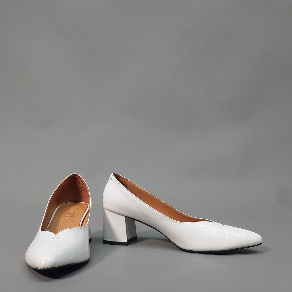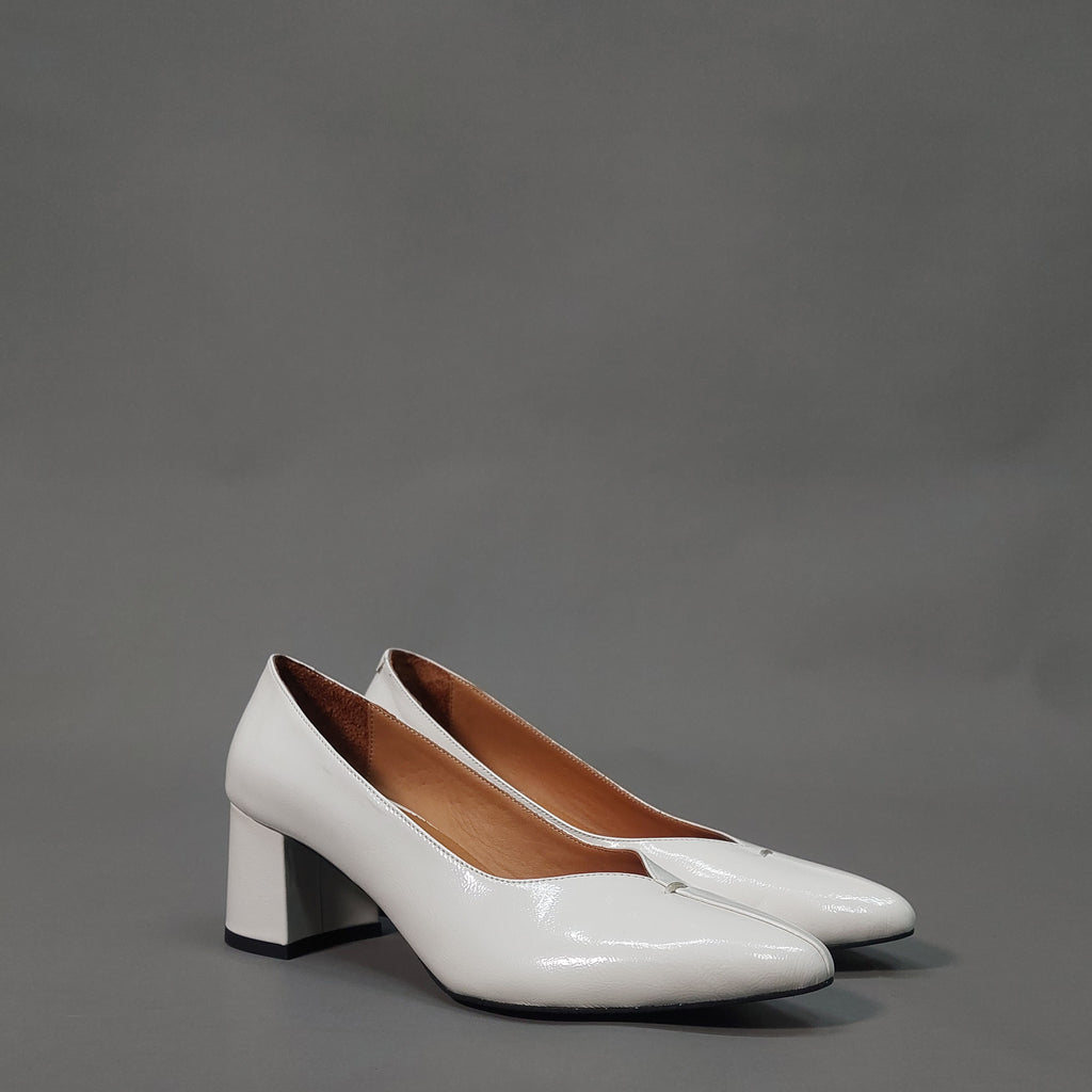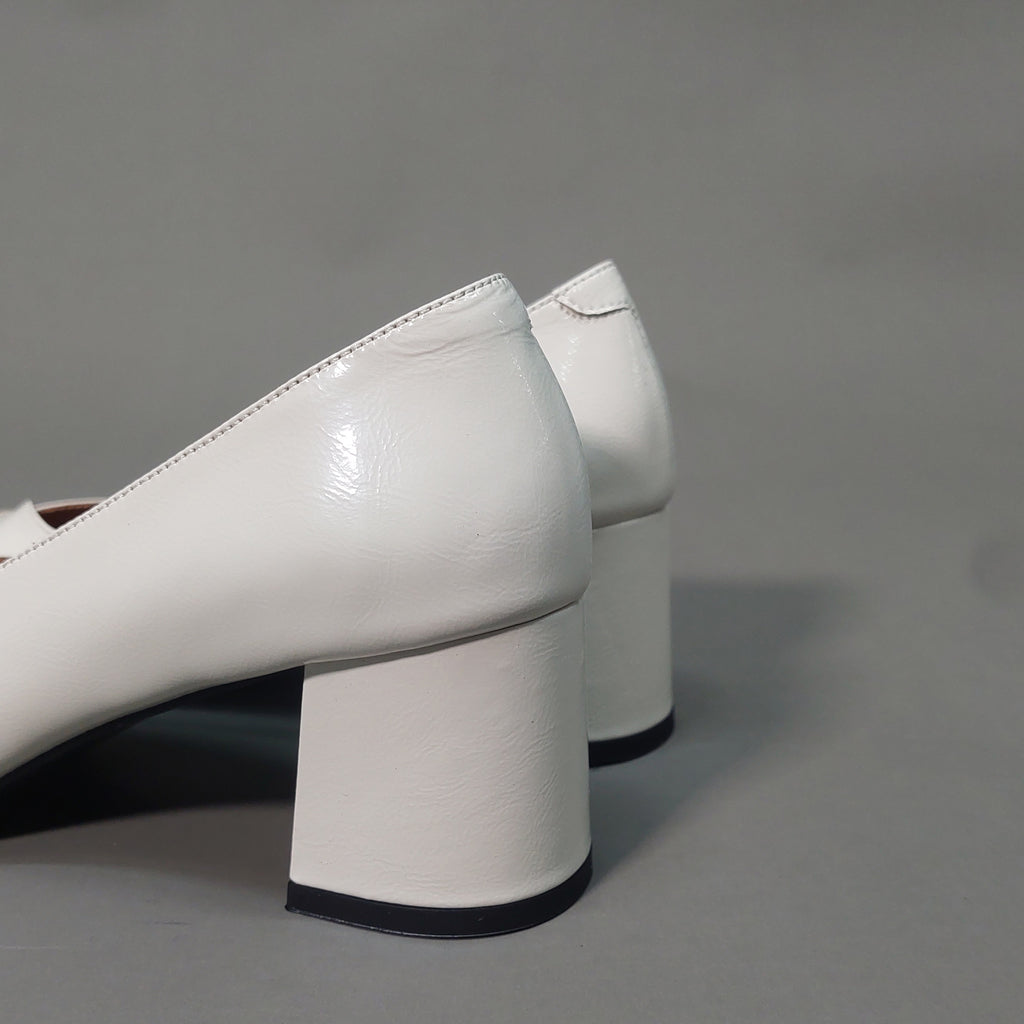 Elegantne salonke izrađene od prirodne kože u bijeloj boji, sa diskretnim sjajem i modernim detaljem na prednjem dijelu. Stabilna blok peta pruža udobnost tokom cjelodnevnog nošenja, dok profinjeni dizajn lako upotpunjuje i poslovne i svečane kombinacije. Unutrašnjost od mekane kože osigurava udobnost i prozračnost.