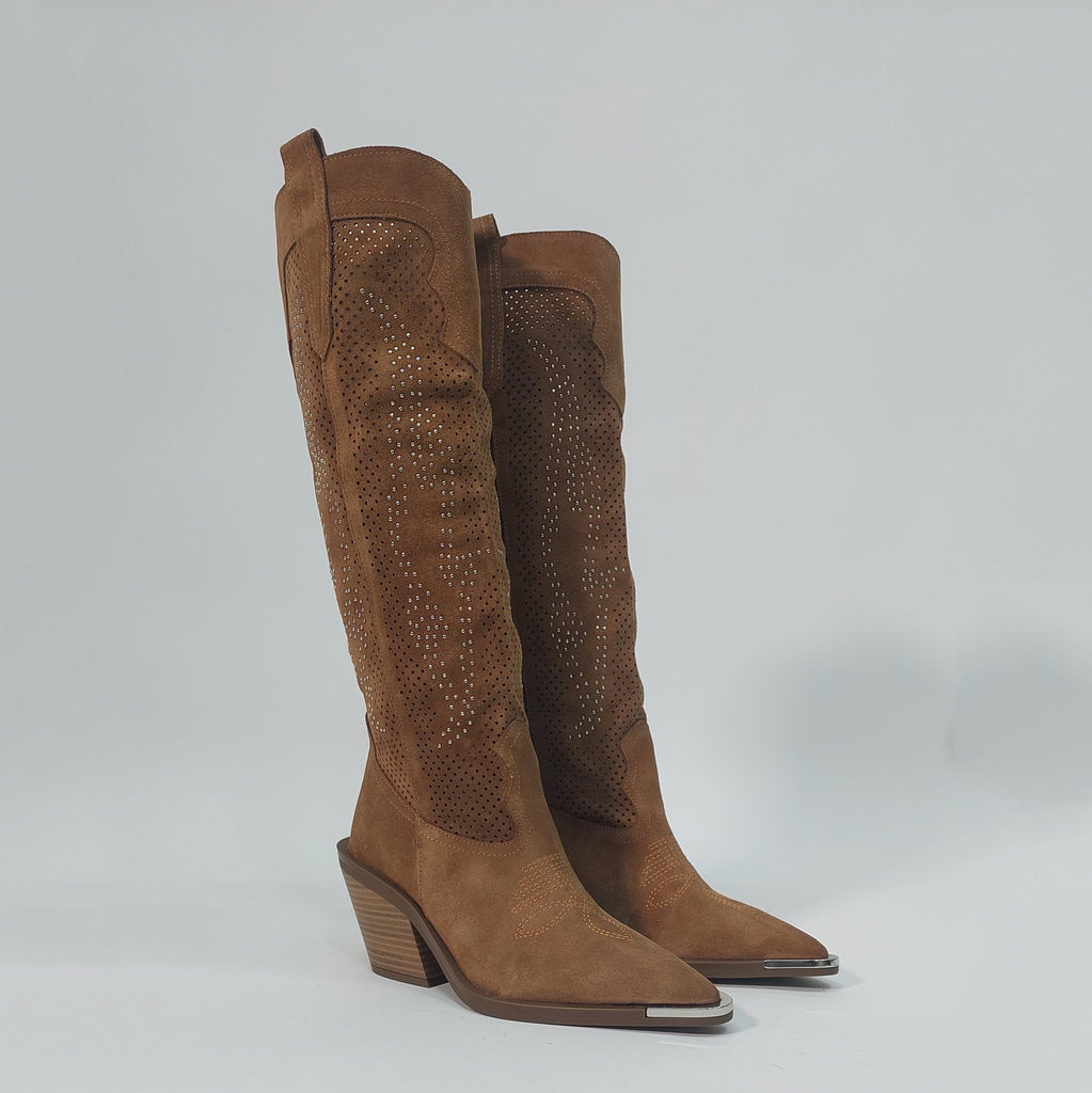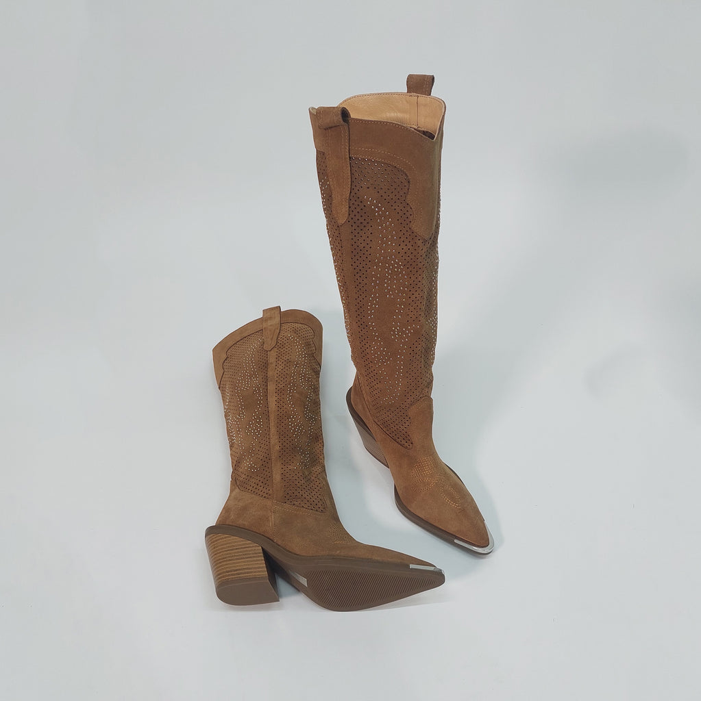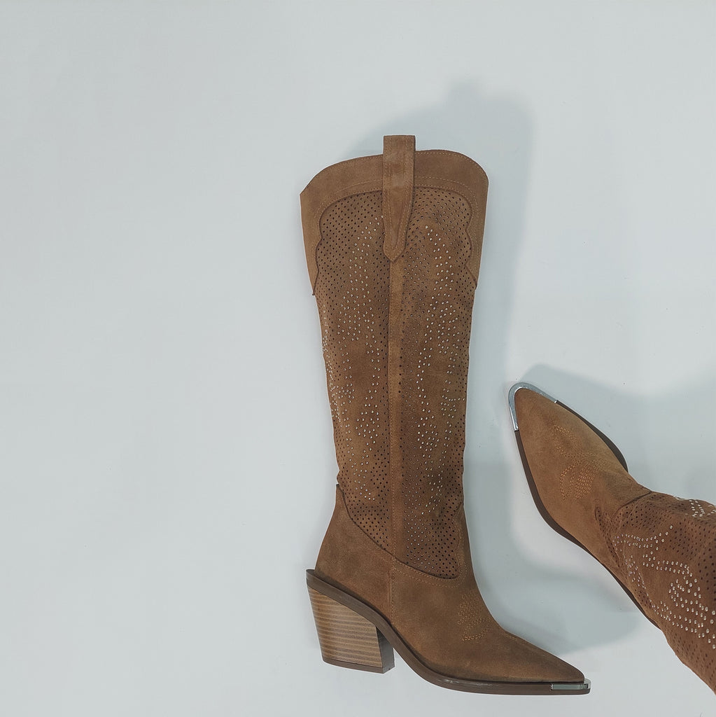 Čizme izrađene od prirodne brušene kože, sa prepoznatljivim wester detaljima i modernim perforacijama ukrašenim sitnim sjajnim aplikacijama. Poseban akcenat daje metalna zaštita na špicu, koja osim što podiže izgled, produžava i trajnost obuće. Stabilna blok peta i anatomski oblikovan kalup osiguravaju udobnost tokom cijelog dana, dok klasična smeđa nijansa čini da se lako kombinuju uz farmerke, haljine ili suknje.