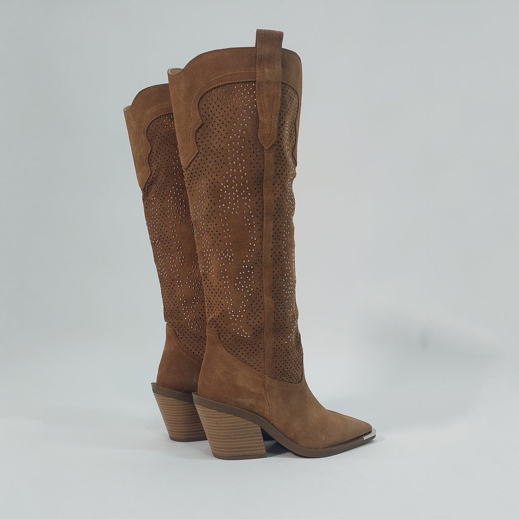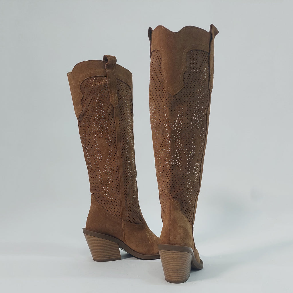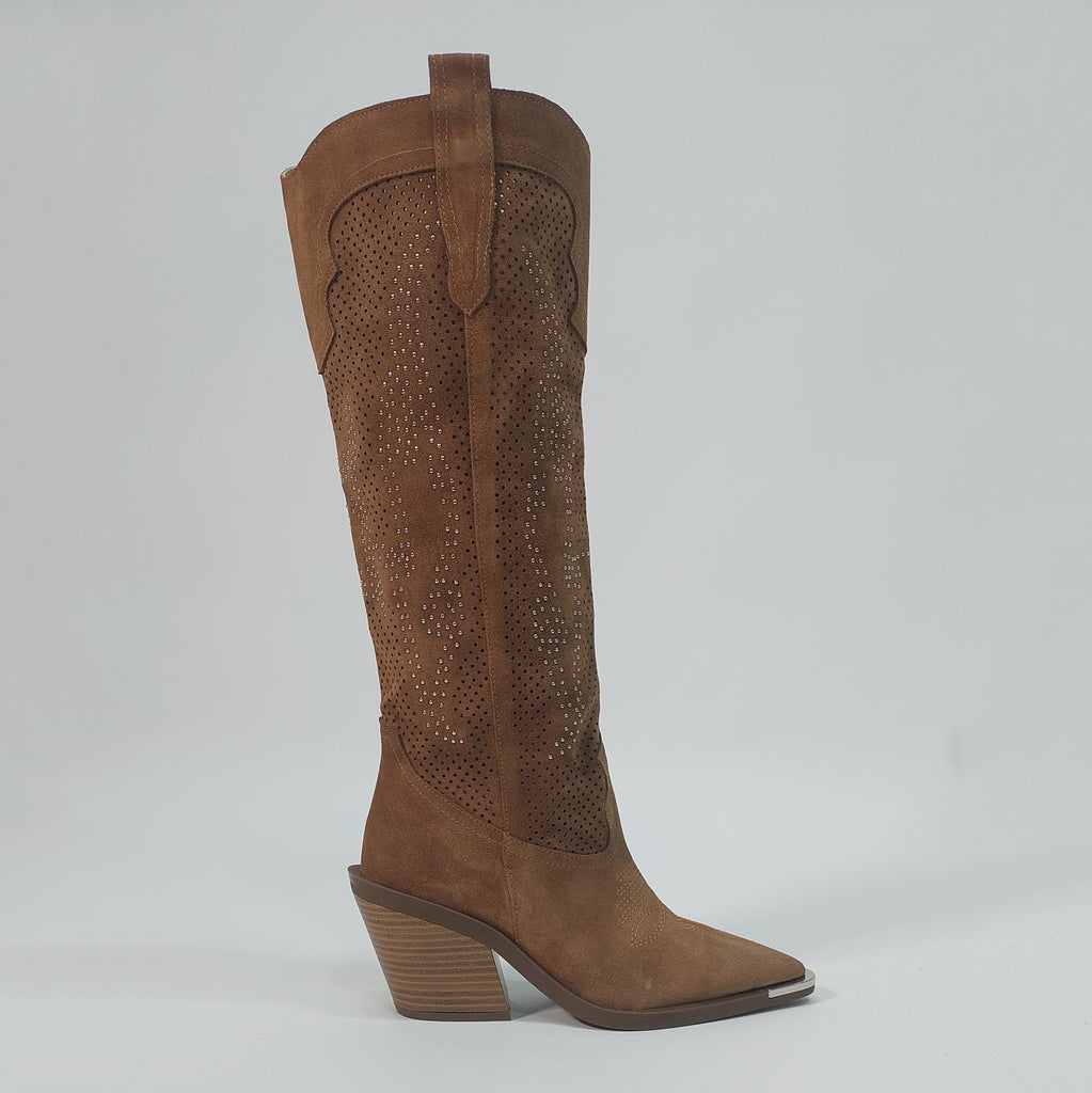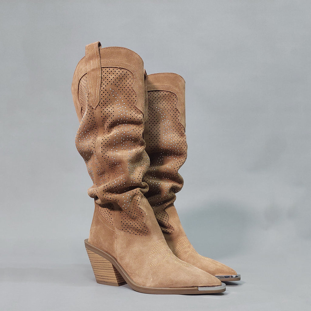 Čizme izrađene od prirodne brušene kože, sa prepoznatljivim wester detaljima i modernim perforacijama ukrašenim sitnim sjajnim aplikacijama. Poseban akcenat daje metalna zaštita na špicu, koja osim što podiže izgled, produžava i trajnost obuće. Stabilna blok peta i anatomski oblikovan kalup osiguravaju udobnost tokom cijelog dana, dok klasična smeđa nijansa čini da se lako kombinuju uz farmerke, haljine ili suknje.