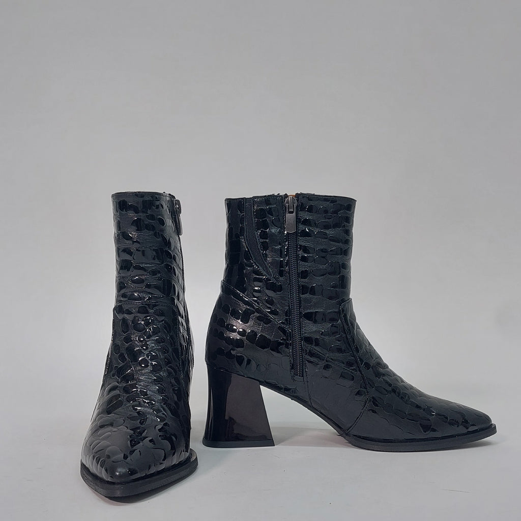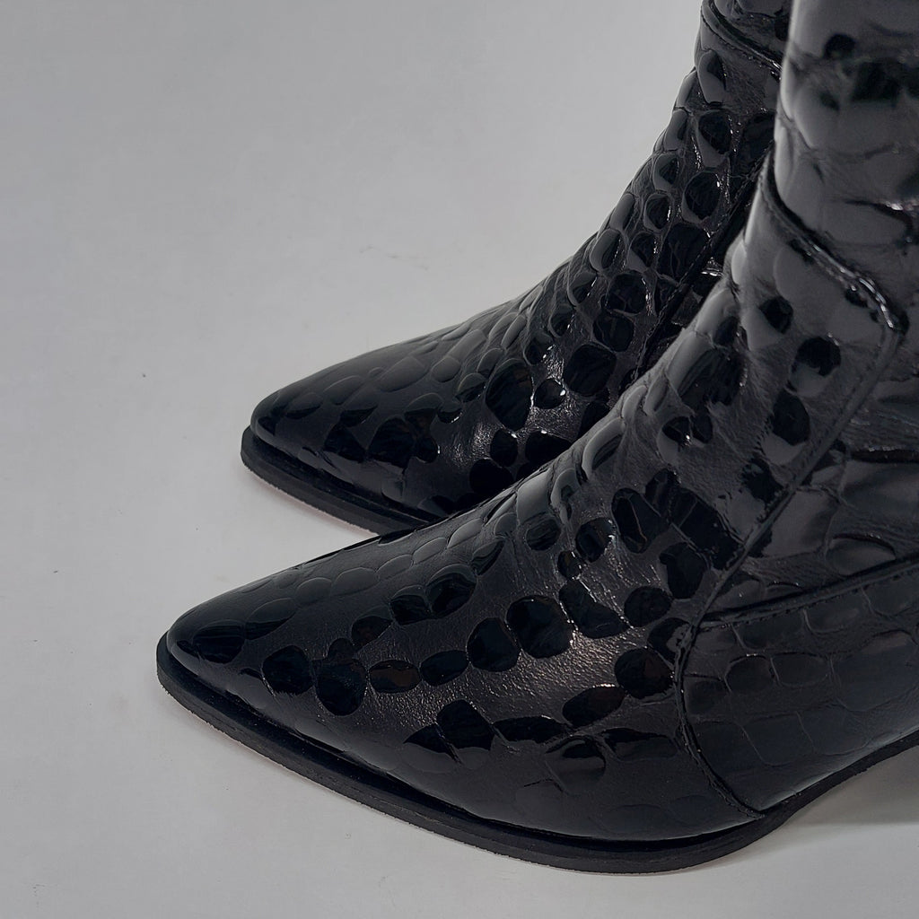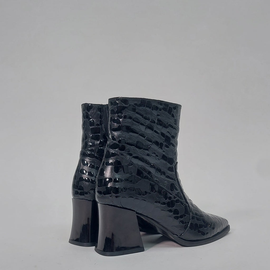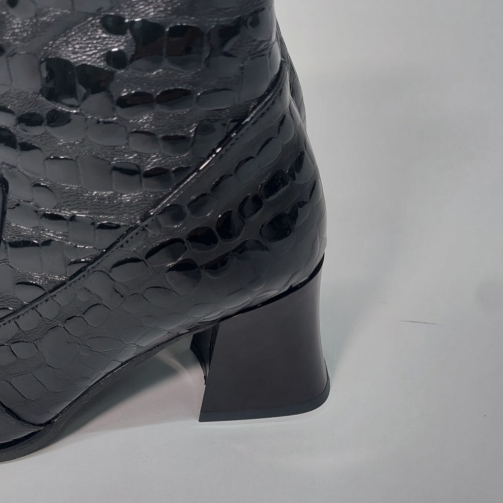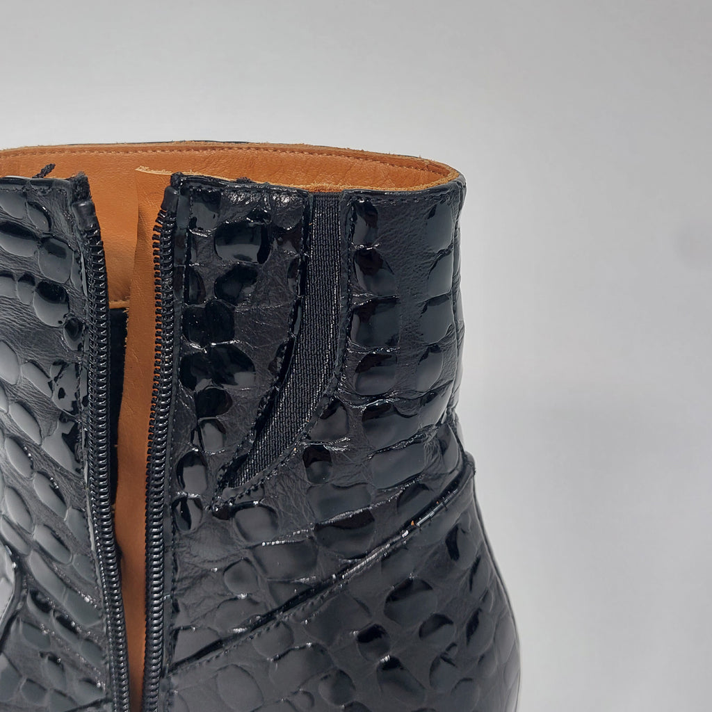 Elegantne crne gležnjače izrađene od prirodne kože sa sjajnim krokodil uzorkom. Model spaja moderan dizajn i udobnost, čineći ga savršenim izborom za dnevne i večernje kombinacije.