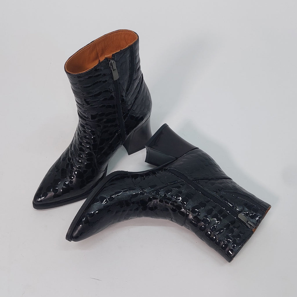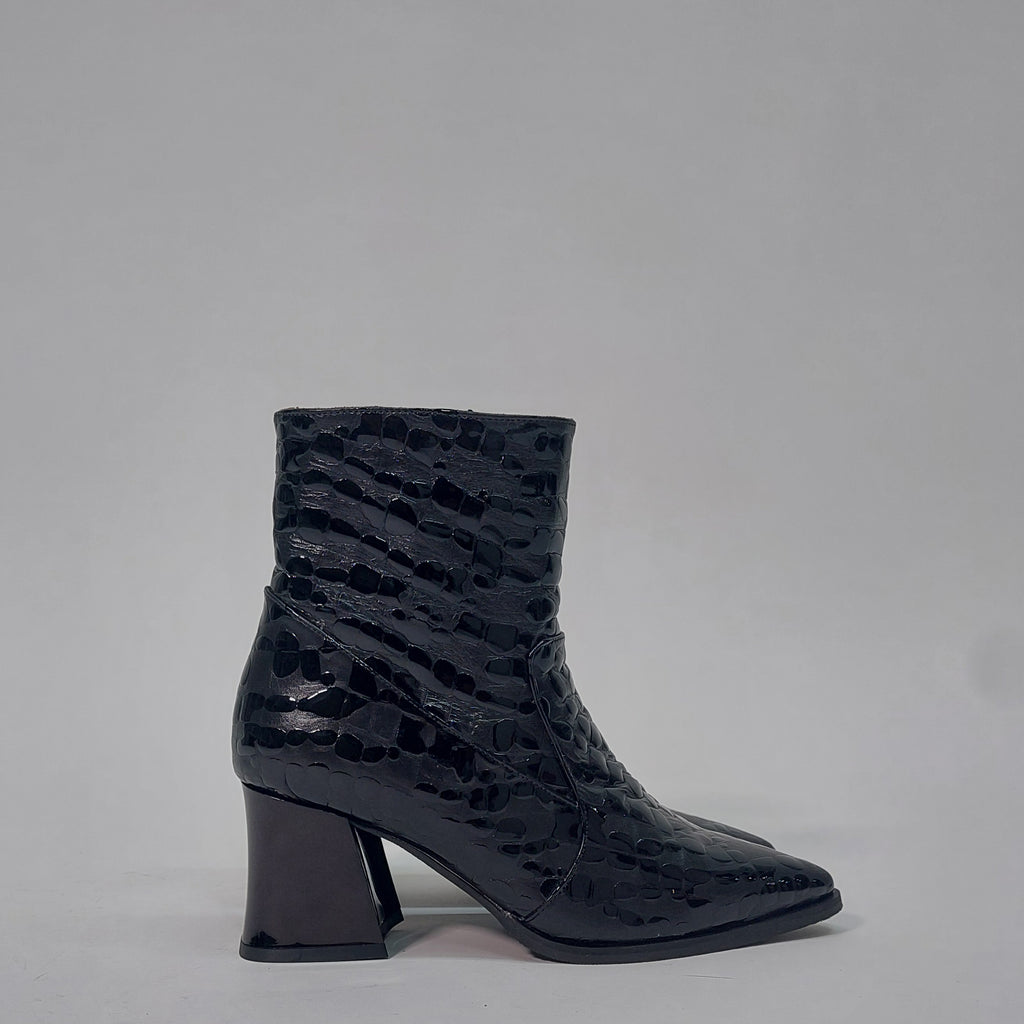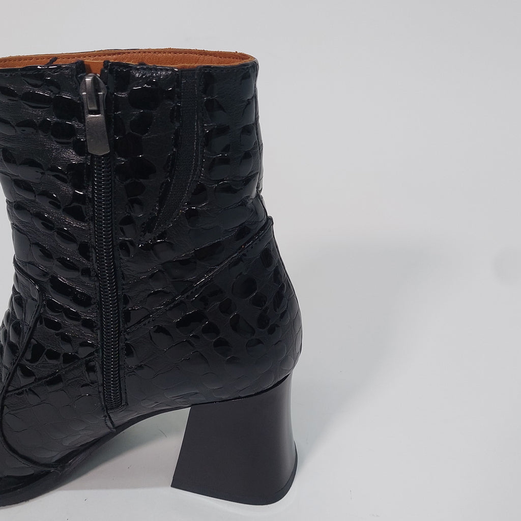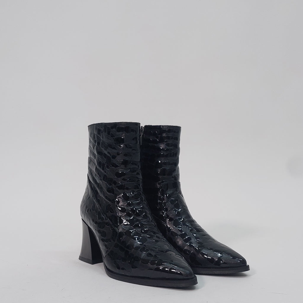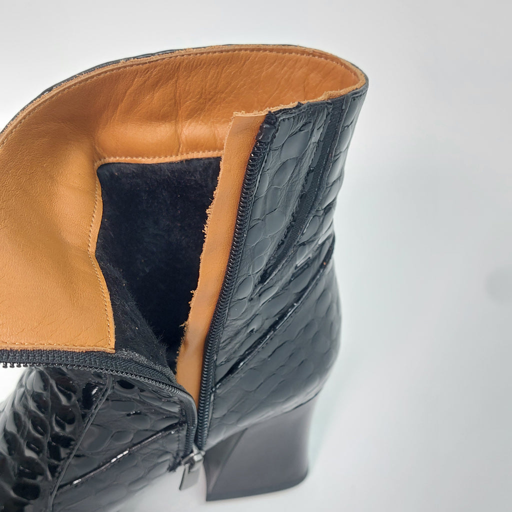 Elegantne crne gležnjače izrađene od prirodne kože sa sjajnim krokodil uzorkom. Model spaja moderan dizajn i udobnost, čineći ga savršenim izborom za dnevne i večernje kombinacije.