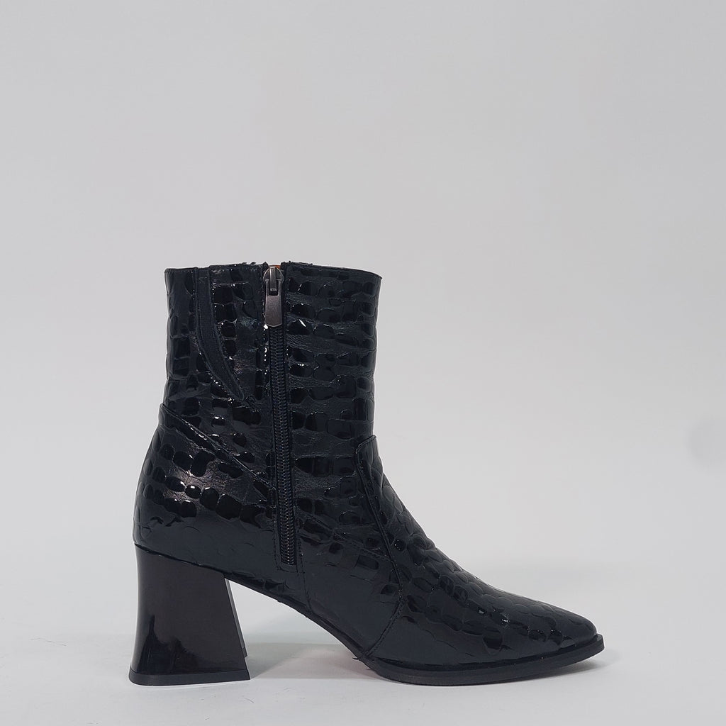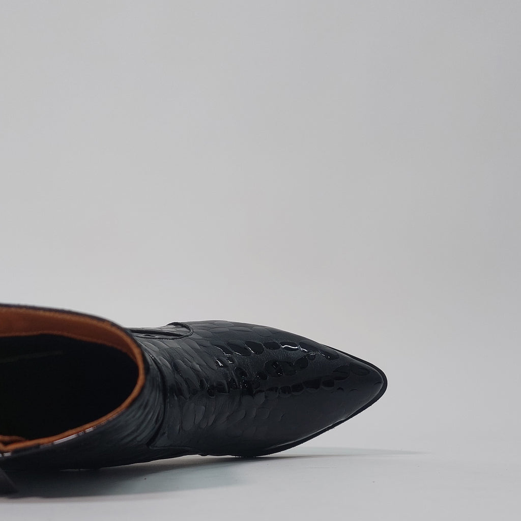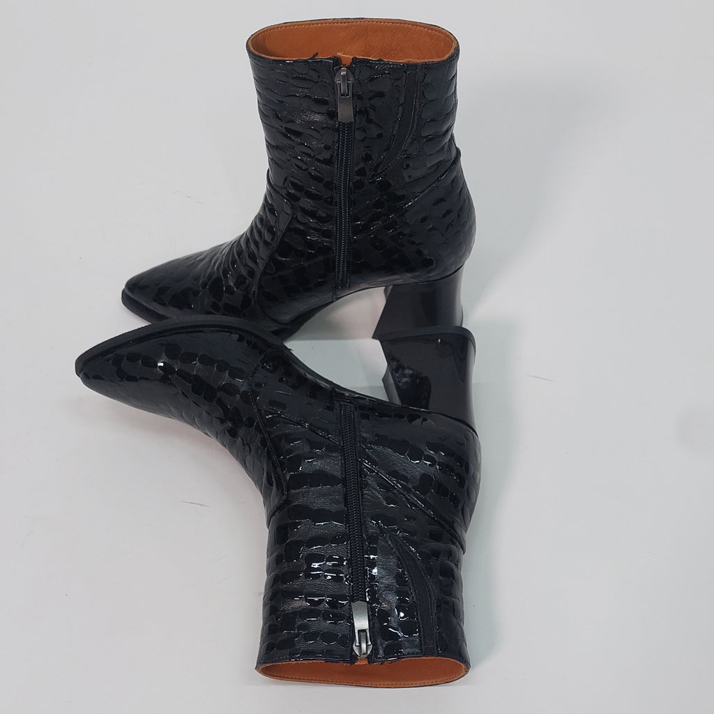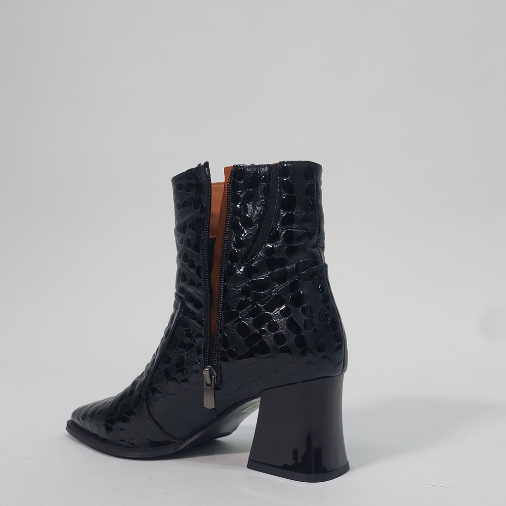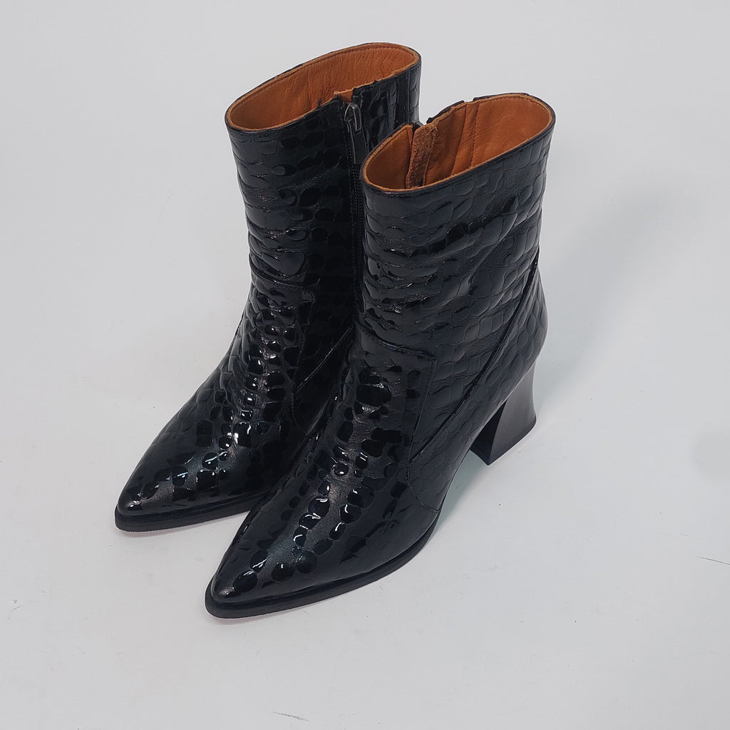 Elegantne crne gležnjače izrađene od prirodne kože sa sjajnim krokodil uzorkom. Model spaja moderan dizajn i udobnost, čineći ga savršenim izborom za dnevne i večernje kombinacije.