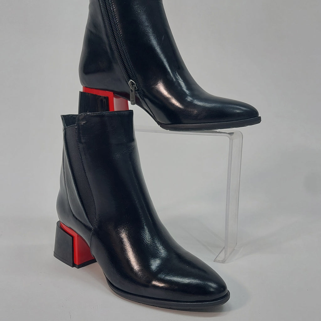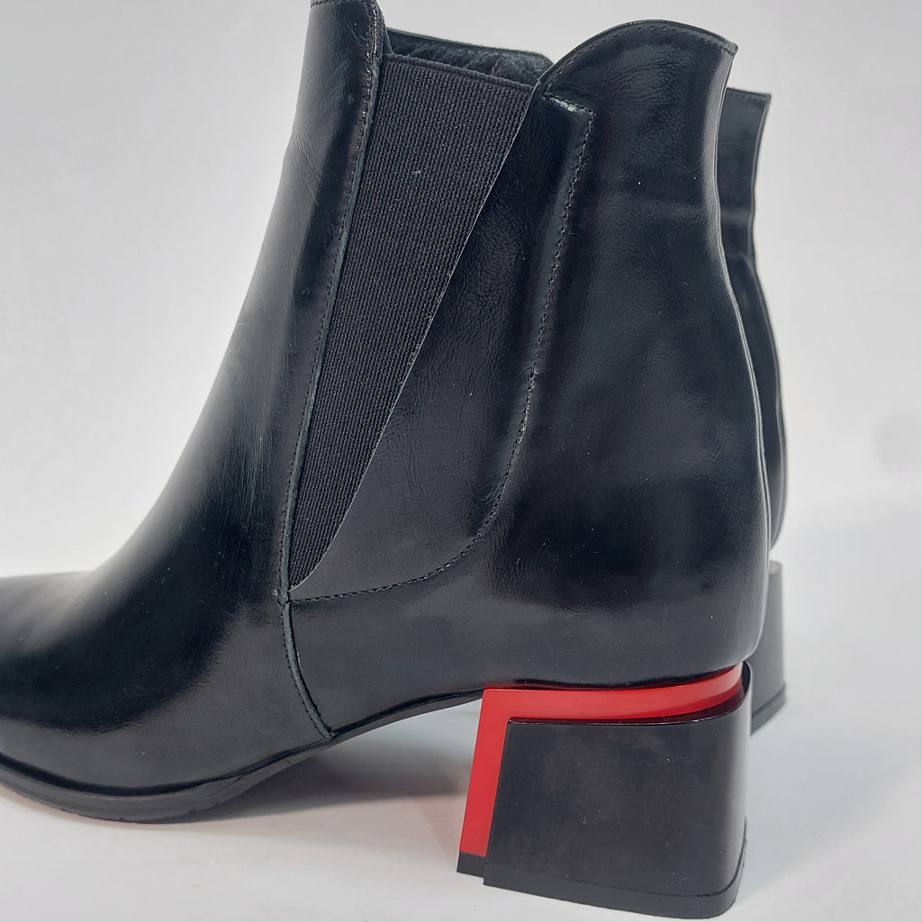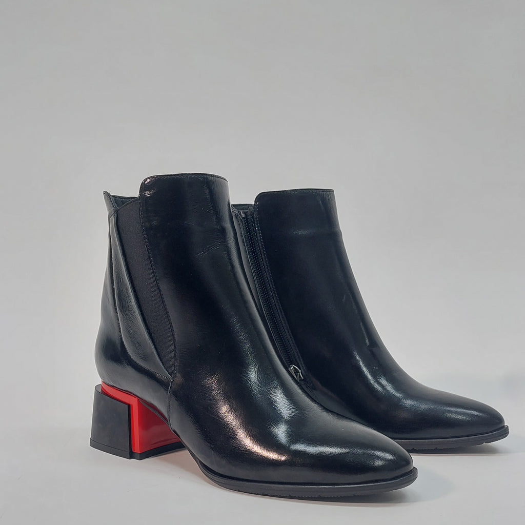 Moderne crne gležnjače od prirodne kože, sa upečatljivim detaljem – kontrastnom crvenom linijom na peti koja daje dozu hrabrosti i unikatnosti svakoj kombinaciji. Klasičan kroj sa bočnim rajsferšlusom osigurava jednostavno obuvanje i savršeno pristajanje. Stabilna blok peta pruža udobnost pri svakodnevnom nošenju, dok glatka koža visokog sjaja podiže eleganciju modela.