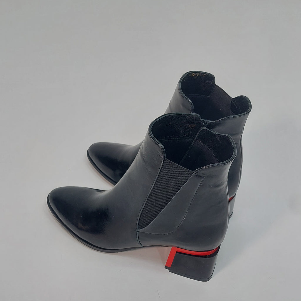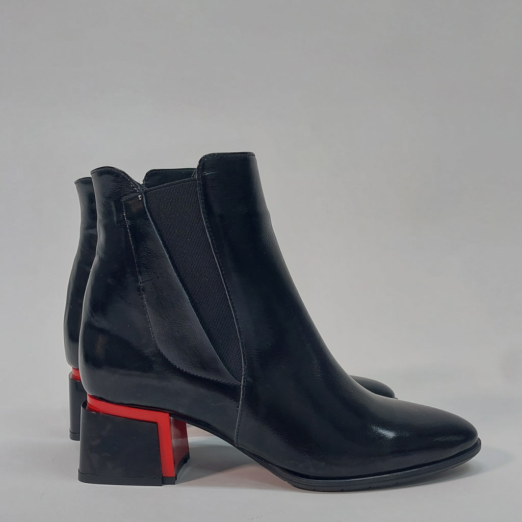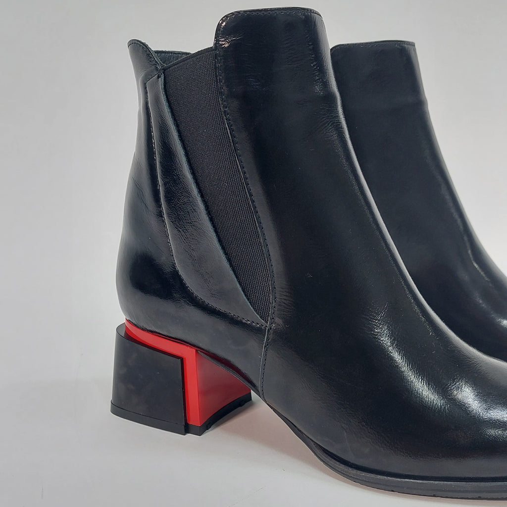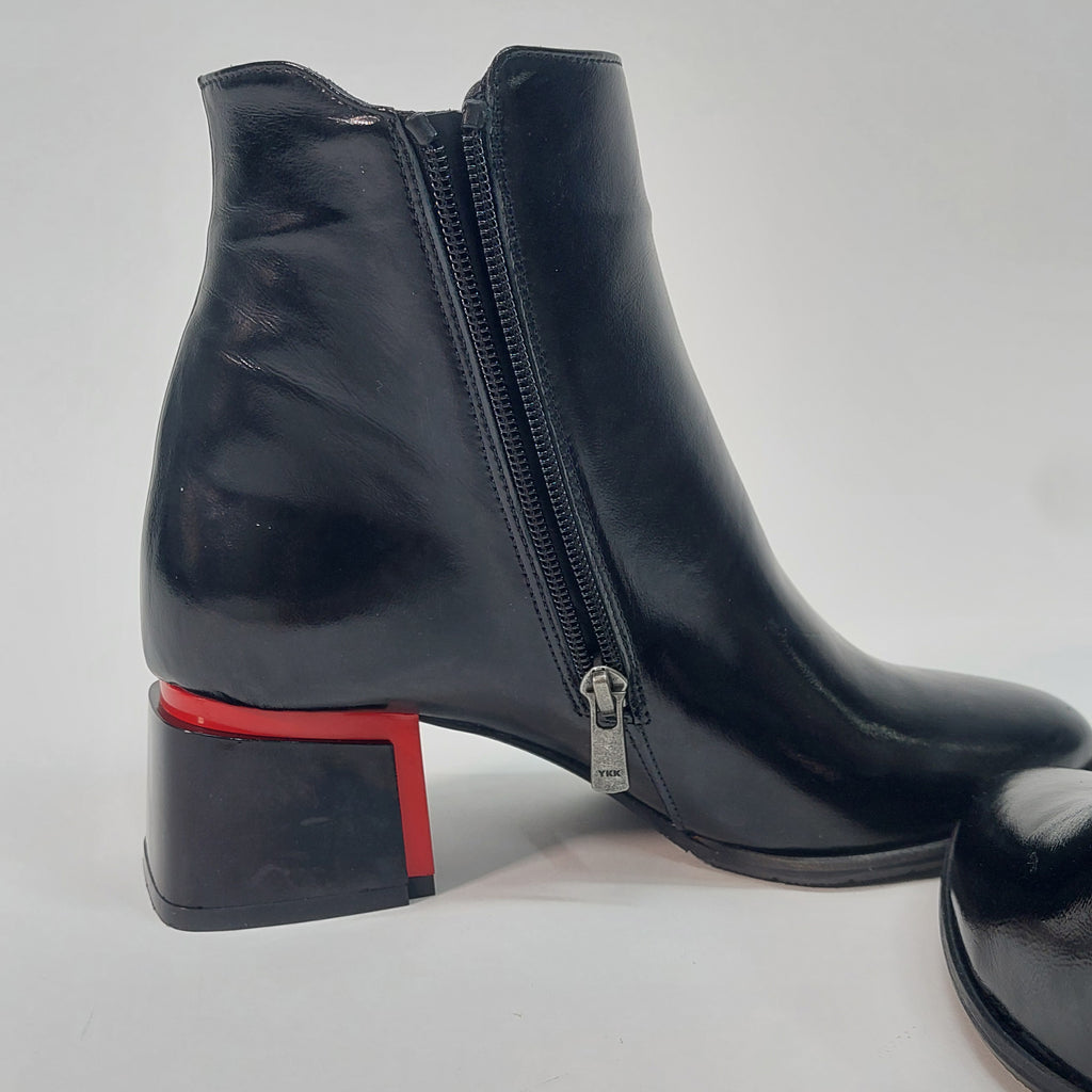 Moderne crne gležnjače od prirodne kože, sa upečatljivim detaljem – kontrastnom crvenom linijom na peti koja daje dozu hrabrosti i unikatnosti svakoj kombinaciji. Klasičan kroj sa bočnim rajsferšlusom osigurava jednostavno obuvanje i savršeno pristajanje. Stabilna blok peta pruža udobnost pri svakodnevnom nošenju, dok glatka koža visokog sjaja podiže eleganciju modela.